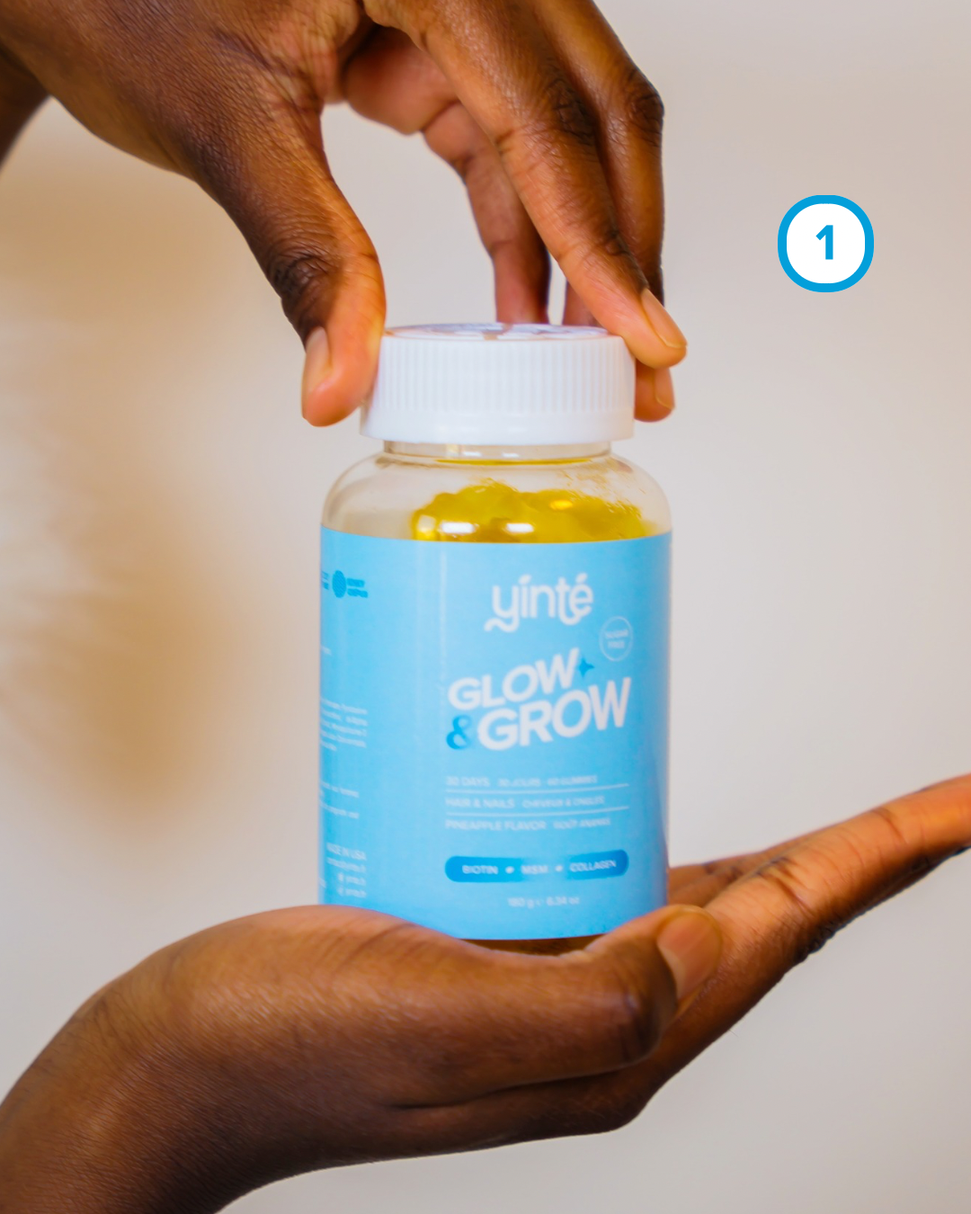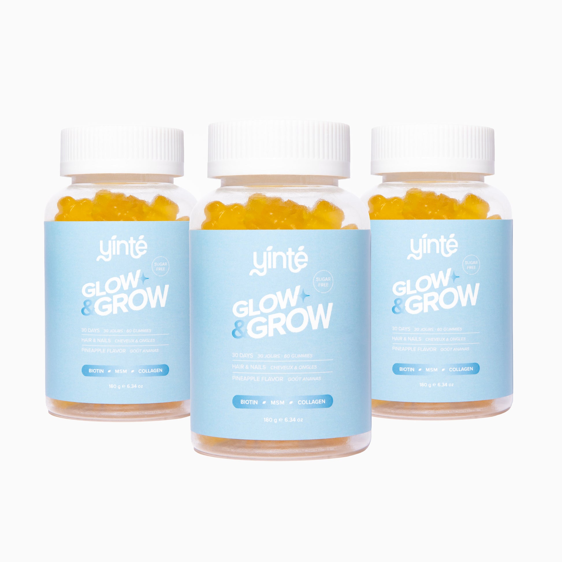 Grâce à la biotine, au MSM et au collagène, les gummies Glow & Grow stimulent la pousse et limitent la casse.